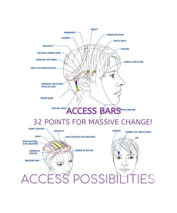 Access Bars® was founded by Gary Douglas in the early 1990s and is now practiced in over 170 countries. Access Bars® is a gentle hands-on modality where a practitioner lightly touches 32 points on the head that relate to different areas of life, helping release stored thoughts, beliefs, and energy that may limit you.